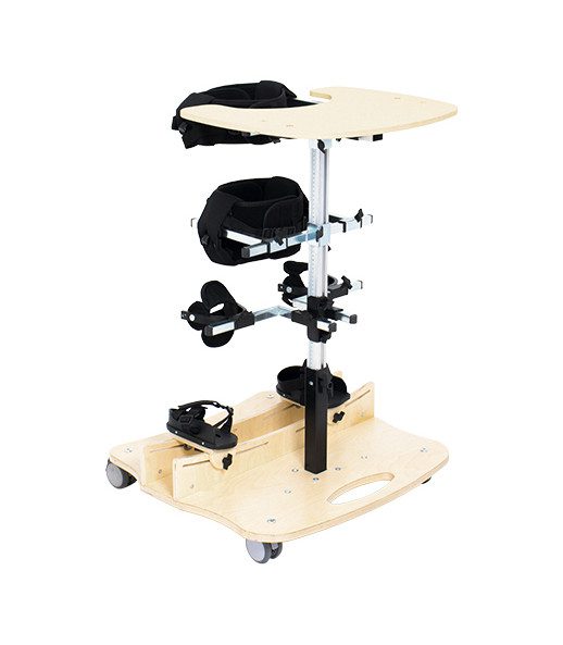 ASTRIDE™ to nowoczesny jednokolumnowy pionizator z funkcją odwiedzenia. Jego konstrukcja umożliwia ustawienie we właściwy sposób głowy kości udowej w panewce stawu biodrowego. Takie ustawienie zapobiega dysplazji stawu biodrowego i zapewnia prawidłowe ustawienie stawów w płaszczyźnie czołowej podczas pionizacji. Poprawna pozycja w pionizatorze ASTRIDE to zasługa odpowiednio ukształtowanych pelot i wygodnych pasów, które gwarantują bezpieczeństwo i komfort podczas użytkowania wyrobu. Odpowiednie ustawienie kończyn dolnych gwarantują obrotowe peloty kolanowe, które je stabilizują i zabezpieczają. Konstrukcja stabilizatorów kolan eliminuje też ucisk na rzepkę kolanową w trakcie użytkowania wyrobu. Ważne są także niezależnie regulowane obejmy piersiowa i biodrowa, ponieważ pozwalają przyjąć i utrzymać prawidłową pozycję ciała. Stabilna podstawa wyposażona w koła z niezależnymi hamulcami umożliwia łatwe przemieszczanie pionizatora między pomieszczeniami. Praktyczny blat stolika ułatwia terapię, oraz wykonywanie codziennych czynności (np. nauka, zabawa, spożywanie posiłków)