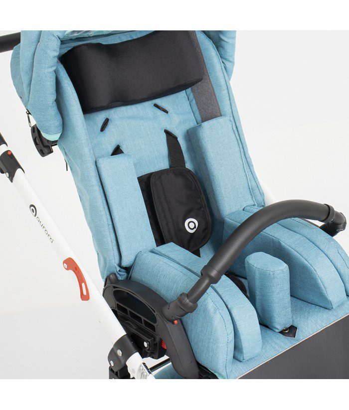AURORA® zapewnia też doskonałą stabilizację boczną dziecka dzięki regulowanym poduszkom i pelotom. Dodatkowo, wózek ma barierkę, pasy 5-punktowe z osłoną i elementy antypoślizgowe, które chronią dziecko przed wypadnięciem lub zsuwaniem się.