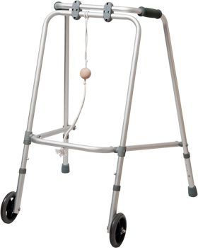 Balkonik rehabilitacyjny z dwoma kółkami przednimi (4”). Jest to sprzęt pomocniczo-rehabilitacyjny do asekuracji podczas chodzenia, ułatwiający poruszanie się osób starszych, niepełnosprawnych mających problemy z utrzymaniem równowagi. Jest składany, łatwy w transporcie i wykonany z aluminium. Drewniana kulka pomaga w składaniu balkonika.