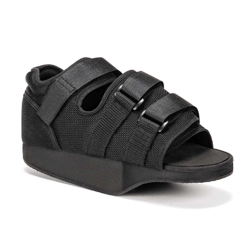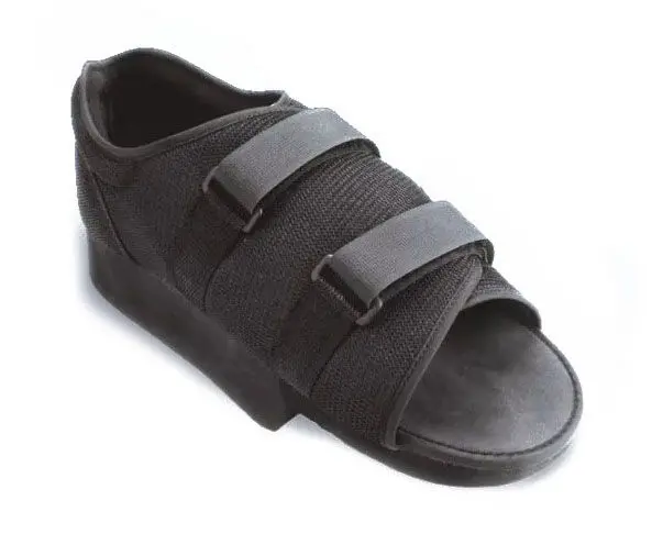 Wykonany z oddychającego materiału but pooperacyjny, którego, wewnątrz wykończony jest antypoślizgową wkładką, natomiast jego przód jest „otwarty”.