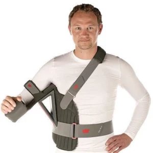 Orteza stawu barkowego typu 50A10N Omo Immobil umożliwia funkcjonalne ułożenie ramienia w odwiedzeniu równym 0°, 15°, 30°, 60° lub 90°. Efektywnie odciąża ona staw barkowy i pomaga w jego rehabilitacji.