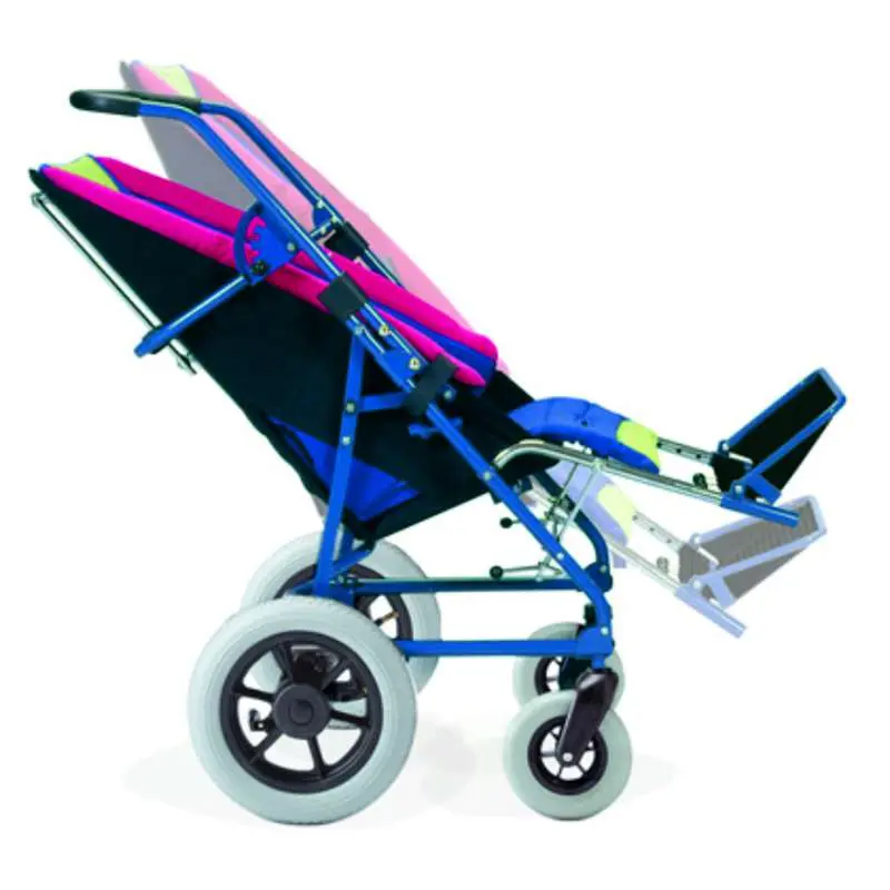 Wózek spacerowy typu kubełkowego, przeznaczony dla dzieci z dużą dysfunkcją układu nerwowego i kostnego. Wózek zawiera trzystopniową regulację odchylenia oparcia oraz podnoszony i regulowany na długość podnóżek.