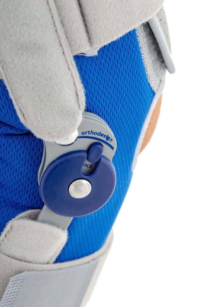Dziecięca otwarta orteza stawu kolanowego AM-DOSK-O/1R to doskonałe rozwiązanie w przypadku konieczności unieruchomienia stawu kolanowego i zapewnienia stabilizacji bocznej. Orteza posiada innowacyjny zegar z możliwością ustawienia kąta zgięcia i wyprostu kolana co 15°, zapewniający, w zależności od potrzeby, ograniczoną ruchomość lub całkowitą immobilizację stawu. Nasza dziecięca orteza kolana została wykonana z najwyższą starannością, gwarantującą Twojemu dziecku komfort i bezpieczeństwo.