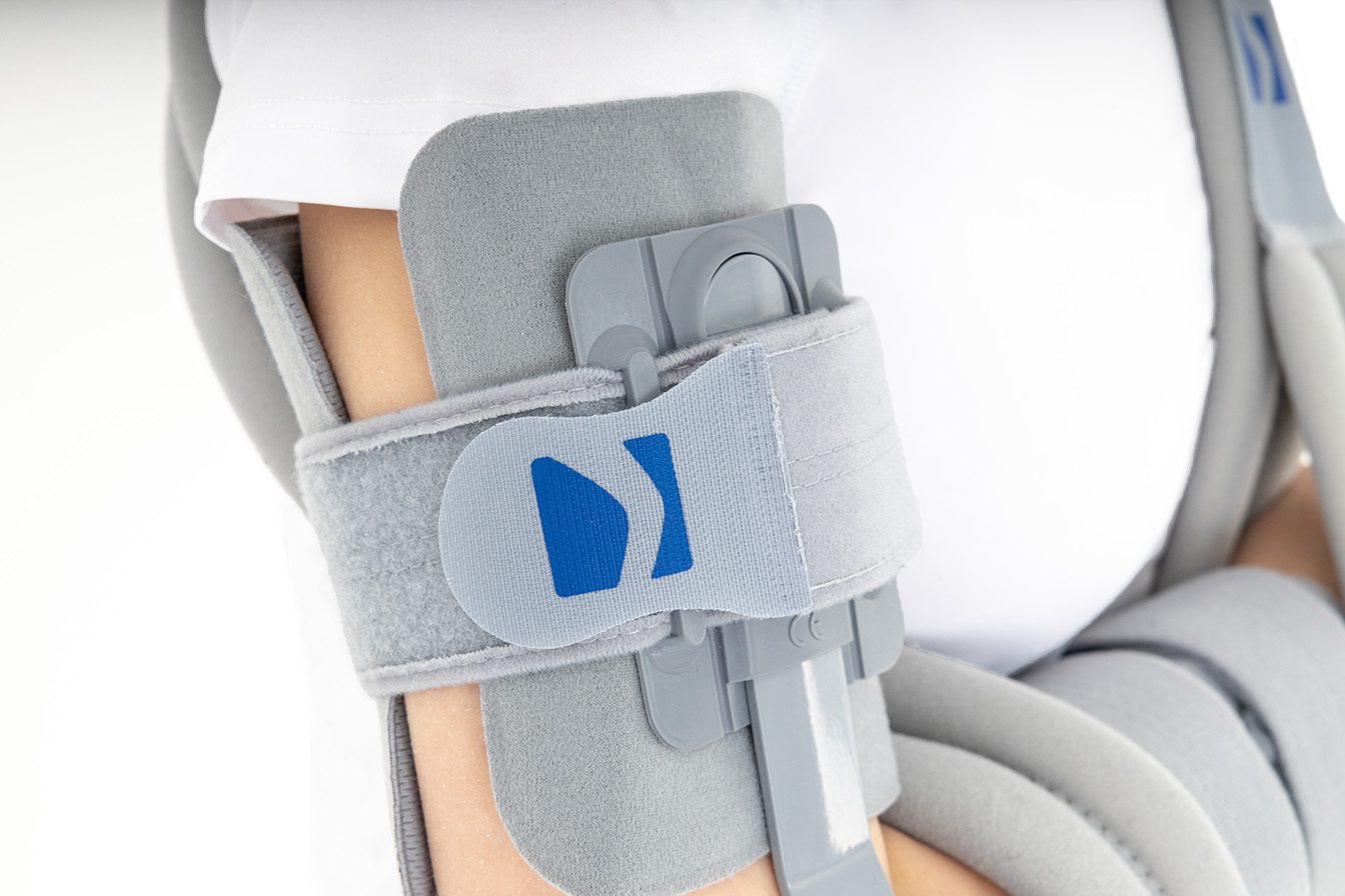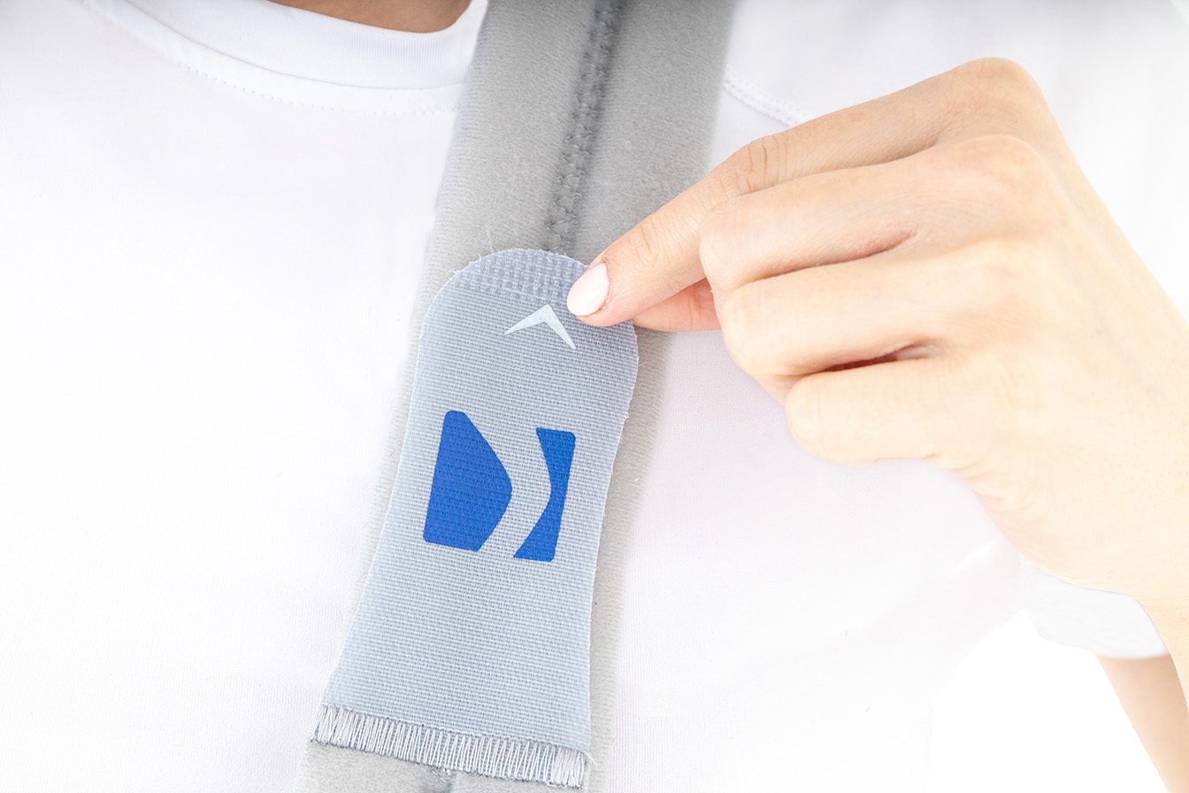 W celu precyzyjnego dopasowania wyrobu do kończyny górnej, w części ramiennej wyrobu zastosowano dwie elastyczne nakładki polietylenowe stabilizowane taśmą Velcro.