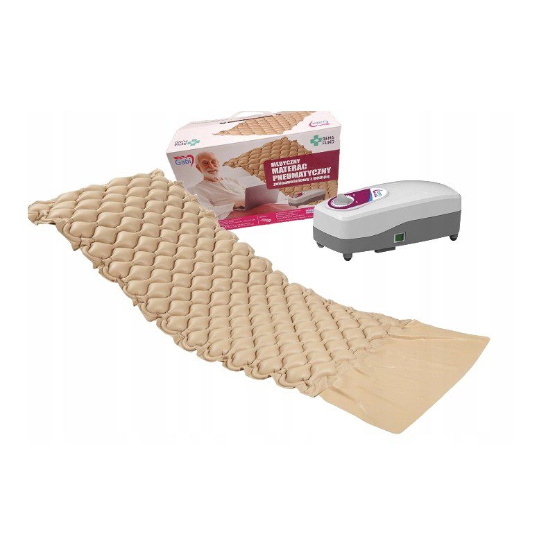 Materac Gabi jest wykonany z medycznego PVC, który jest wytrzymały, nietoksyczny i łatwy w utrzymaniu w czystości. Materac ma 130 komór (bąbelków), które naprzemiennie wypełniają się powietrzem w cyklach co 12 minut. Dzięki temu materac zmienia ciśnienie na skórze pacjenta, zapobiegając długotrwałemu uciskowi naczyń krwionośnych i niedotlenieniu tkanek. Materac dopasowuje się do kształtu i pozycji ciała pacjenta, zapewniając mu wygodę i ulgę.