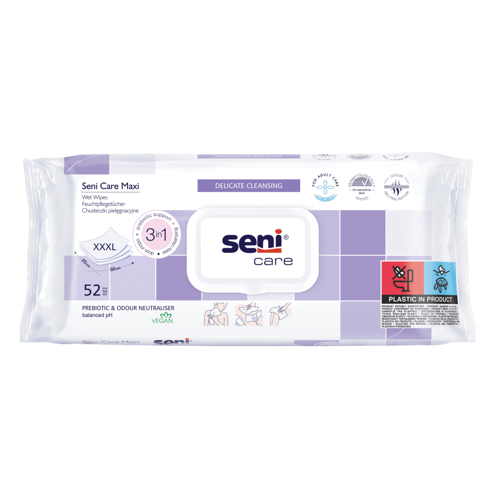 Chusteczki Seni Care Maxi są największymi w ofercie Seni (25x30 cm). Zawierają prebiotyk, który wspiera dobrą florę bakteryjną i substancję, która neutralizuje przykry zapach. Opakowanie zamykane klapką, która chroni chusteczki przed wysychaniem.