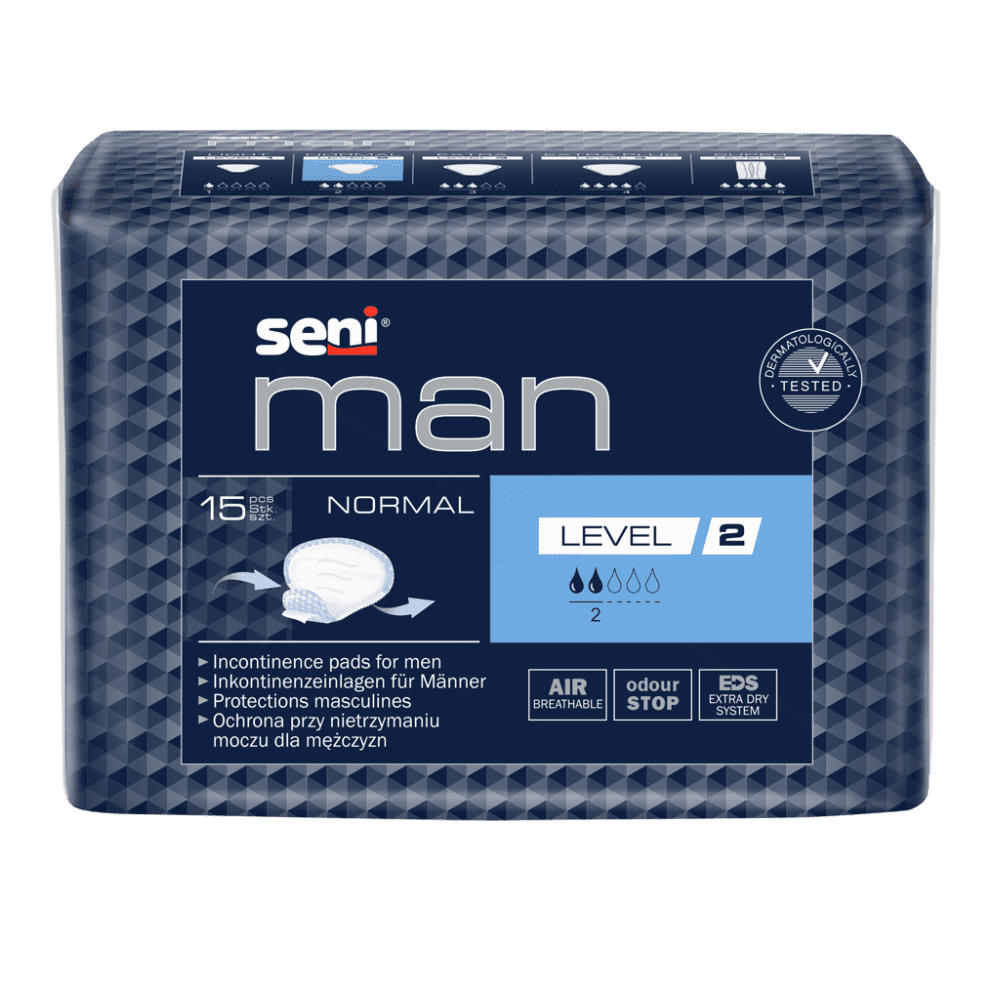 Oddychające wkładki urologiczne Seni Man Normal Level 2 to skuteczna ochrona dla mężczyzn z lekkim nietrzymaniem moczu.
