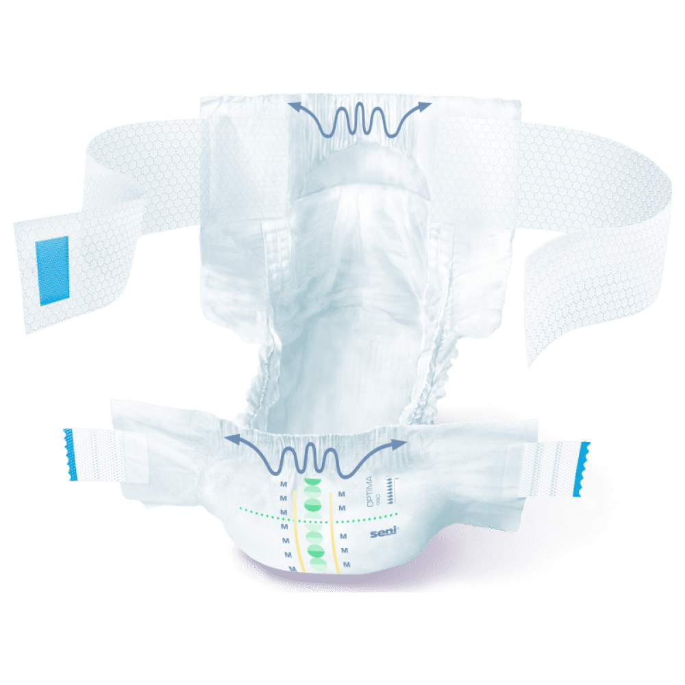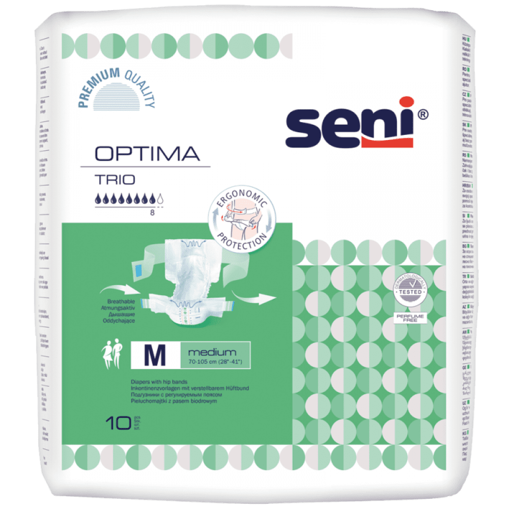 Pieluchy z regulowanym pasem biodrowym Seni Optima Trio przeznaczone są dla osób z ciężkim oraz bardzo ciężkim stopniem nietrzymania moczu. Seni Optima Trio to: