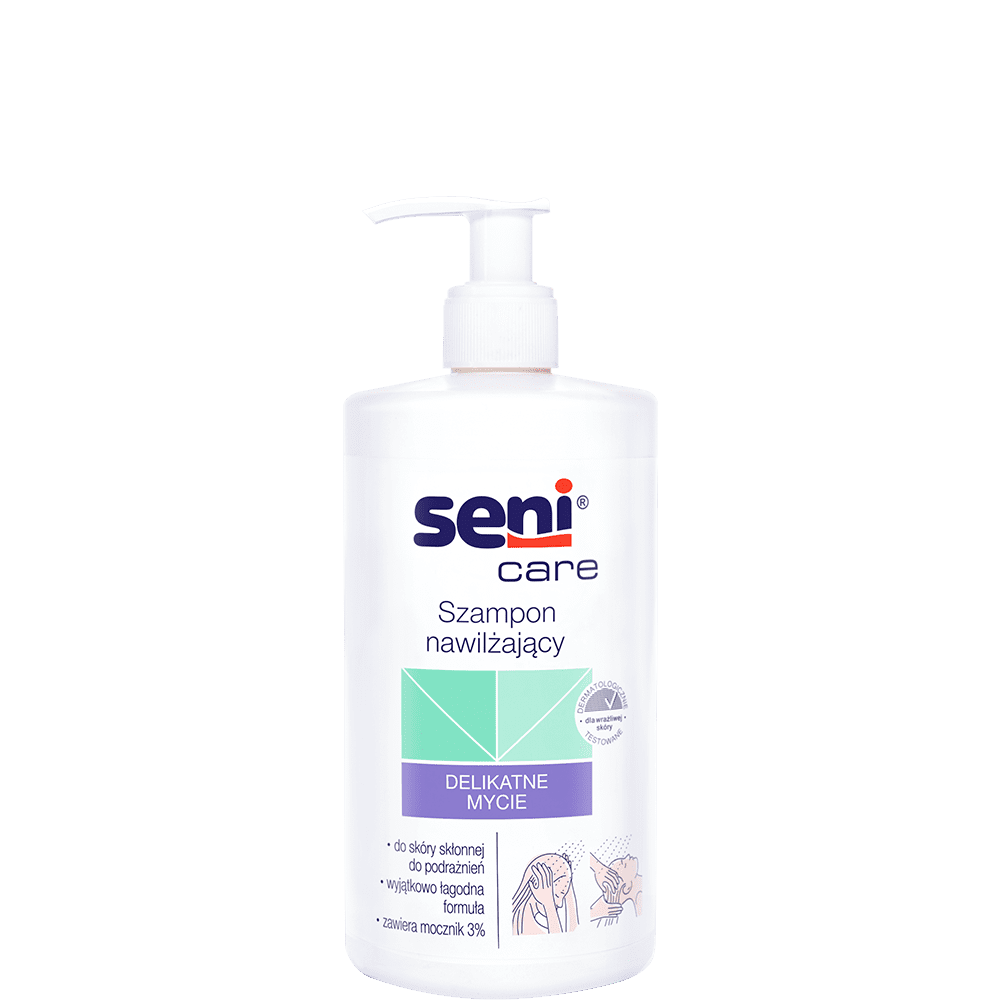 Chory leżący, którego głowa przez większość czasu spoczywa na poduszce, narażony jest na większą potliwość skóry, podrażnienia i przesuszenia naskórka. Szampon Seni Care przeznaczony do każdego rodzaju włosów, delikatnie się pieni i łatwo spłukuje, co jest szczególnie ważne przy pielęgnacji osób leżących. Zawiera 3% mocznika, który wspiera naturalne złuszczanie suchego naskórka oraz nawilża skórę głowy, pozostawiając ją gładką i odżywioną. Kompleks witamin poprawia kondycję włosów i przywraca im zdrowy wygląd.