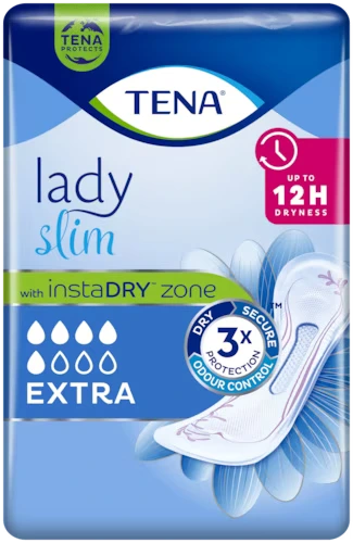 Zapewniająca maksymalne bezpieczeństwo podpaska TENA Lady Slim Extra jest idealna do stosowania przy niespodziewanych wyciekach w średnim stopniu nietrzymania moczu. Strefa instaDRY™ natychmiast odprowadza płyn od skóry do wewnątrz podpaski, zapewniając długotrwałe uczucie suchości aż do 12 godzin. TENA Lady Slim Extra to najlepsze rozwiązanie dla kobiet doświadczających nietrzymania moczu. Dzięki elastycznym bokom, które delikatnie dopasowują się do kształtu ciała, ta miękka podpaska na nietrzymanie moczu jest wygodna w noszeniu. Zachowaj poczucie pewności niezależnie od sytuacji dzięki błyskawicznemu wchłanianiu i wygodnemu dopasowaniu, które zapewnią ochronę podczas niespodziewanych wycieków.