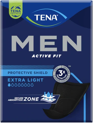 Koniec z dramatem przeciekania dzięki wkładce męskiej TENA Men Active Fit — to ochrona przed niewielkimi przeciekami, nieprzyjemnym zapachem oraz wilgocią. Mają zaledwie 3 mm grubości i subtelny czarny kolor. Te wygodne i dyskretne wkładki ochronne na nietrzymanie moczu wchłaniają niewielkie kropelki i przecieki, aby czuć się świeżo i pewnie. Zaprojektowane do ciała mężczyzny, w delikatnym trójkątnym kształcie, z bezpieczną strefą chłonną, która chroni przed przeciekaniem. Wkładki są pakowane pojedynczo i utrzymują się na swoim miejscu dzięki samoprzylepnemu paskowi. Po założeniu zapomnisz, że ją nosisz, abyś mógł się skupić na swoim aktywnym życiu — w siłowni, w biurze lub w ruchu.
