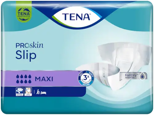 TENA Slip Maxi to uniwersalny produkt na nietrzymanie moczu o otwartej konstrukcji z regulowanymi rzepami umożliwiającymi idealne dopasowanie, dzięki czemu zapewnia komfort i ochronę przed przeciekaniem. W przeciwieństwie do wielu standardowych pieluchomajtek dla dorosłych TENA Slip ProSkin wykonane są z materiału podobnego do tkaniny, zapewniają ścisłe dopasowanie i wysokie zabezpieczenie przed przeciekaniem. To idealne rozwiązanie dla osób z ograniczeniami ruchowymi lub podczas zmiany w łóżku. Dzięki technologii FeelDry Advanced™ produkt szybko wchłania płyn, pozostawiając suchą skórę. Szybkochłonny wkład błyskawicznie wiąże wewnątrz nawet duże ilości moczu, dając uczucie suchości, a w pełni oddychający panel tylny ConfioAir™ pozwala skórze oddychać. Wszystkie te cechy pomagają zachować naturalne zdrowie skóry. Otwarta konstrukcja z mocnymi rzepami umożliwia łatwą zmianę produktu w pozycji leżącej lub stojącej. Rzepy można wielokrotnie zapinać i odpinać, aby uzyskać idealne dopasowanie. Produkt zapewnia większą świeżość dzięki neutralizatorowi zapachu oraz wskaźnikowi wilgoci, który pokazuje, kiedy należy zmienić produkt.