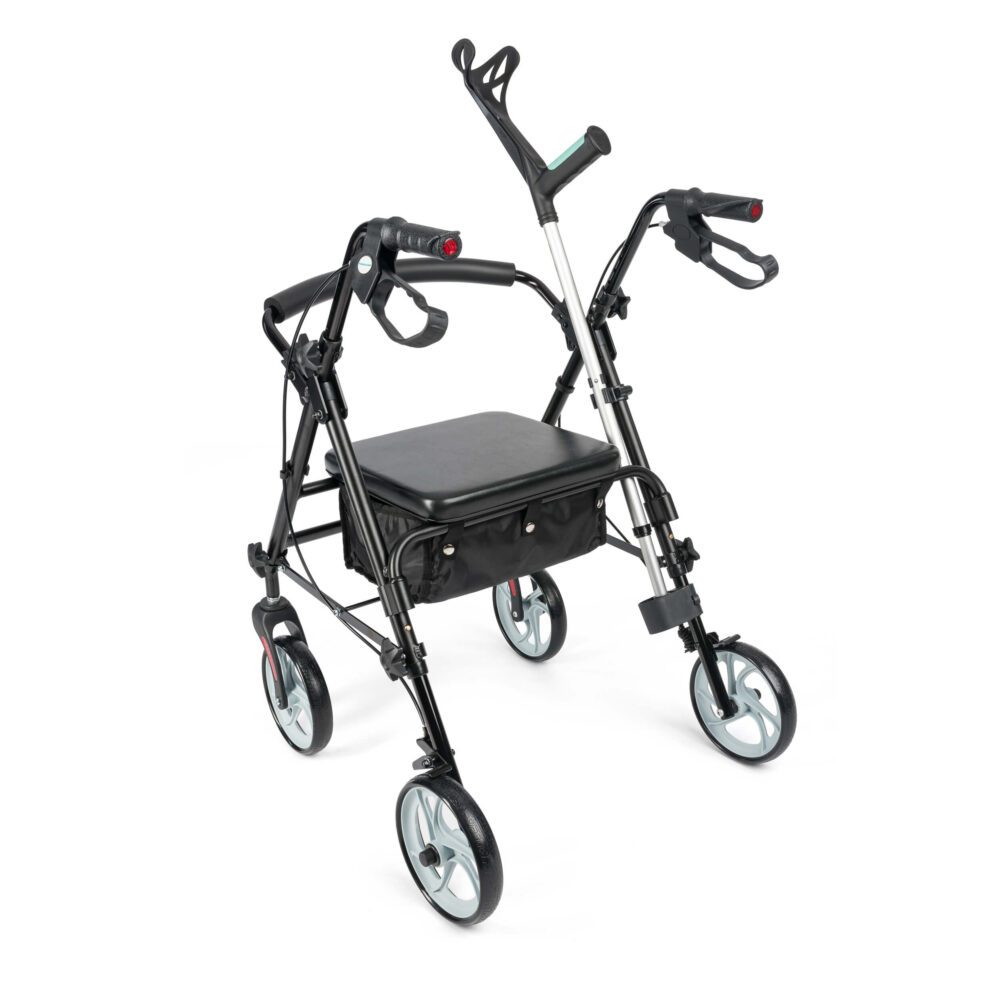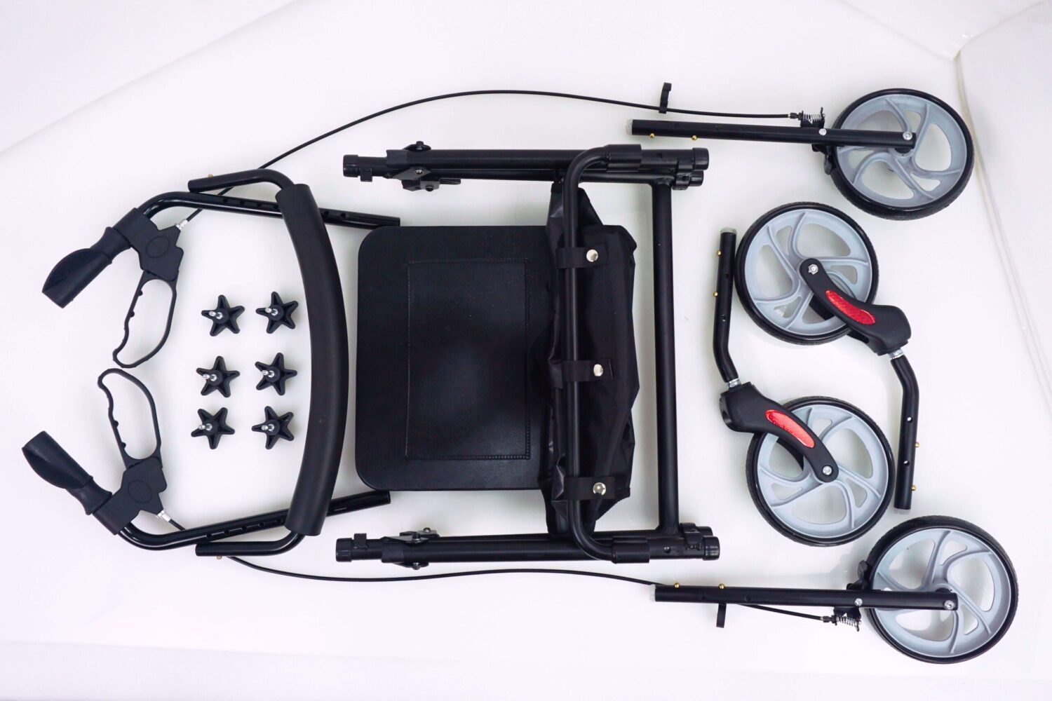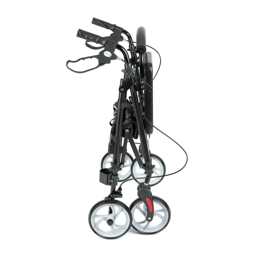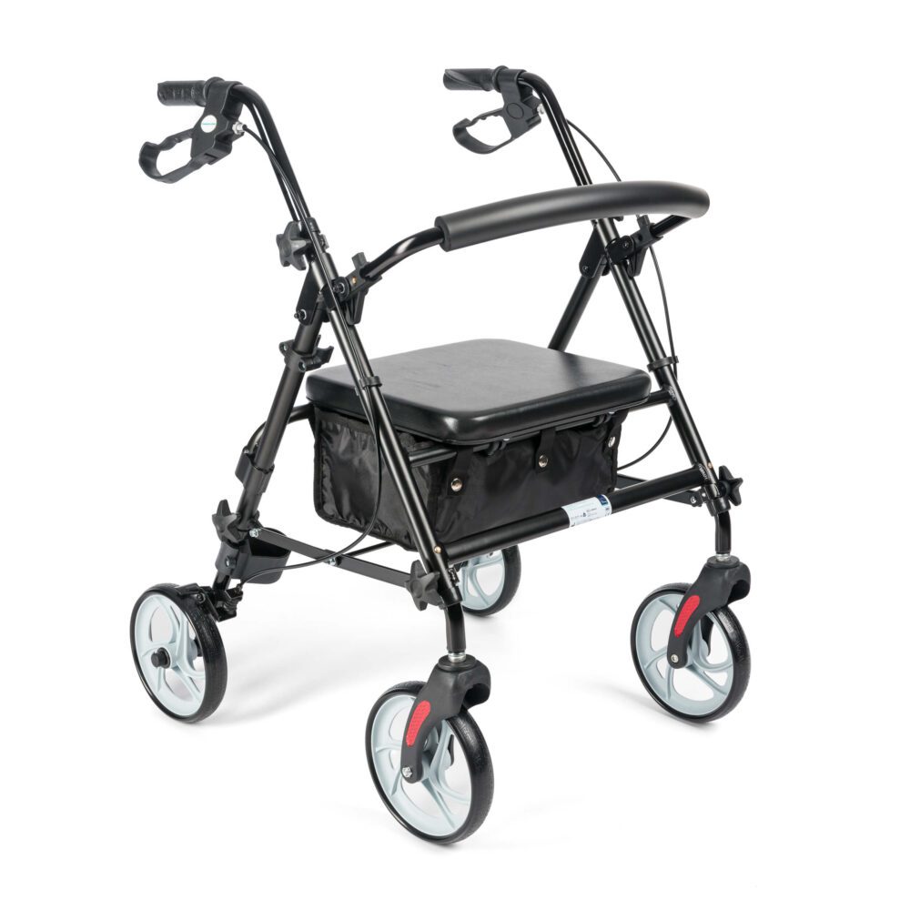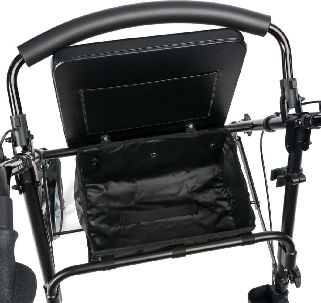 Podpórka czterokołowa aluminiowa - CARBON - składana, wykonana z ramy aluminiowej powlekanej farbą z metalicznym połyskiem. Posiada szerokie tapicerowane siedzisko, miękkie oparcie i koszyk.