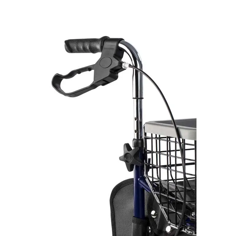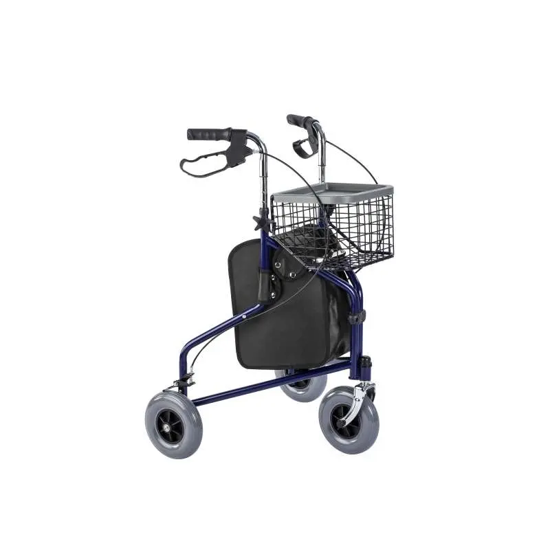 Podpórka trójkołowa to sprzęt pomocny w poruszaniu się po pomieszczeniach oraz w ruchu drogowym. Złożona jest z ramy stalowej w kolorze niebieskim, na której osadzone są 3 pełne koła z hamulcem postojowym, regulowane na wysokość rączki oraz anatomiczne uchwyty dopasowane do dłoni użytkownika. Całość posiada funkcję składania. Oferta produktu zawiera również demontowany koszyk z tacką oraz torbę zakupową zapinaną na zamek.